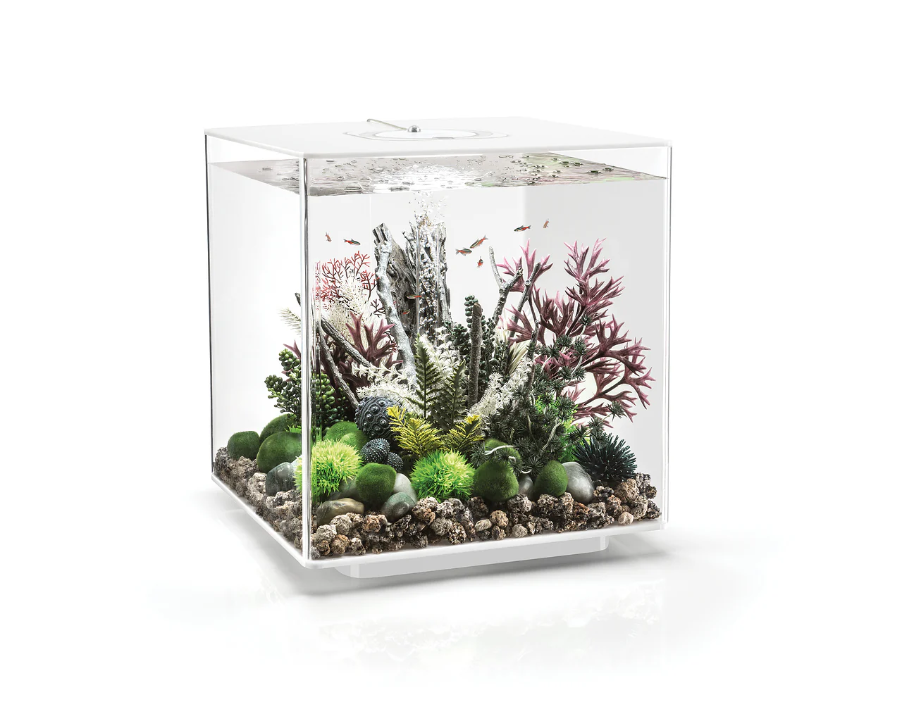 Das Aquarium biOrb CUBE 60 MCR ist in einen schwarzen, weißen oder transparenten Rahmen eingefasst. Diese große Variante ist 40 cm lang, 40 cm breit, 43,3 cm hoch und fasst 60 Liter Wasser.