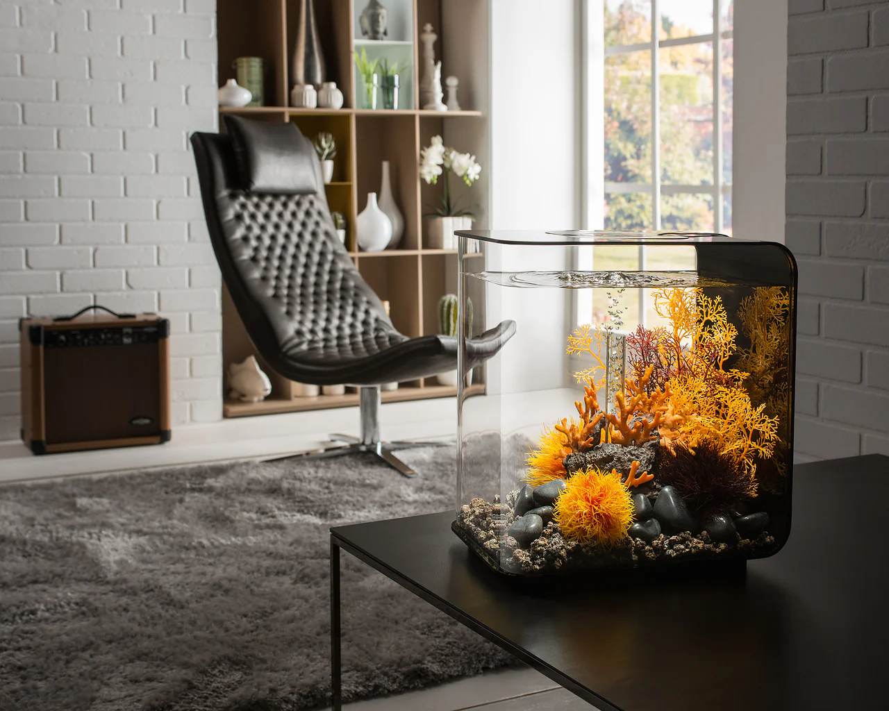 Zum Komplettset gehören neben dem Acrylaquarium eine langlebige LED-Lichteinheit, eine Aquarienpumpe, ein Transformator, ein Ausströmerstein, Bodengrund aus Keramik sowie eine Filterkartusche. Das patentierte Filtersystem ist am Boden im schwarzen Fuß des Aquariums verborgen. Die Kombination aus biologischer, chemischer und mechanischer Filterung macht aus dem biOrb ein vollständig gefiltertes Aquarium.